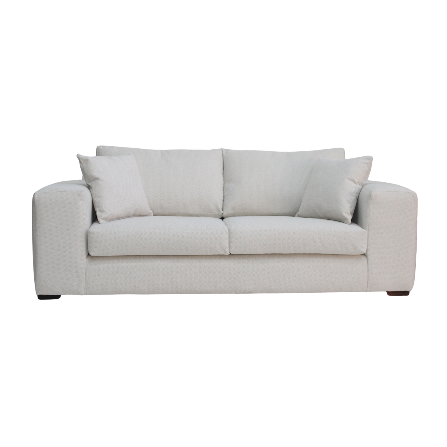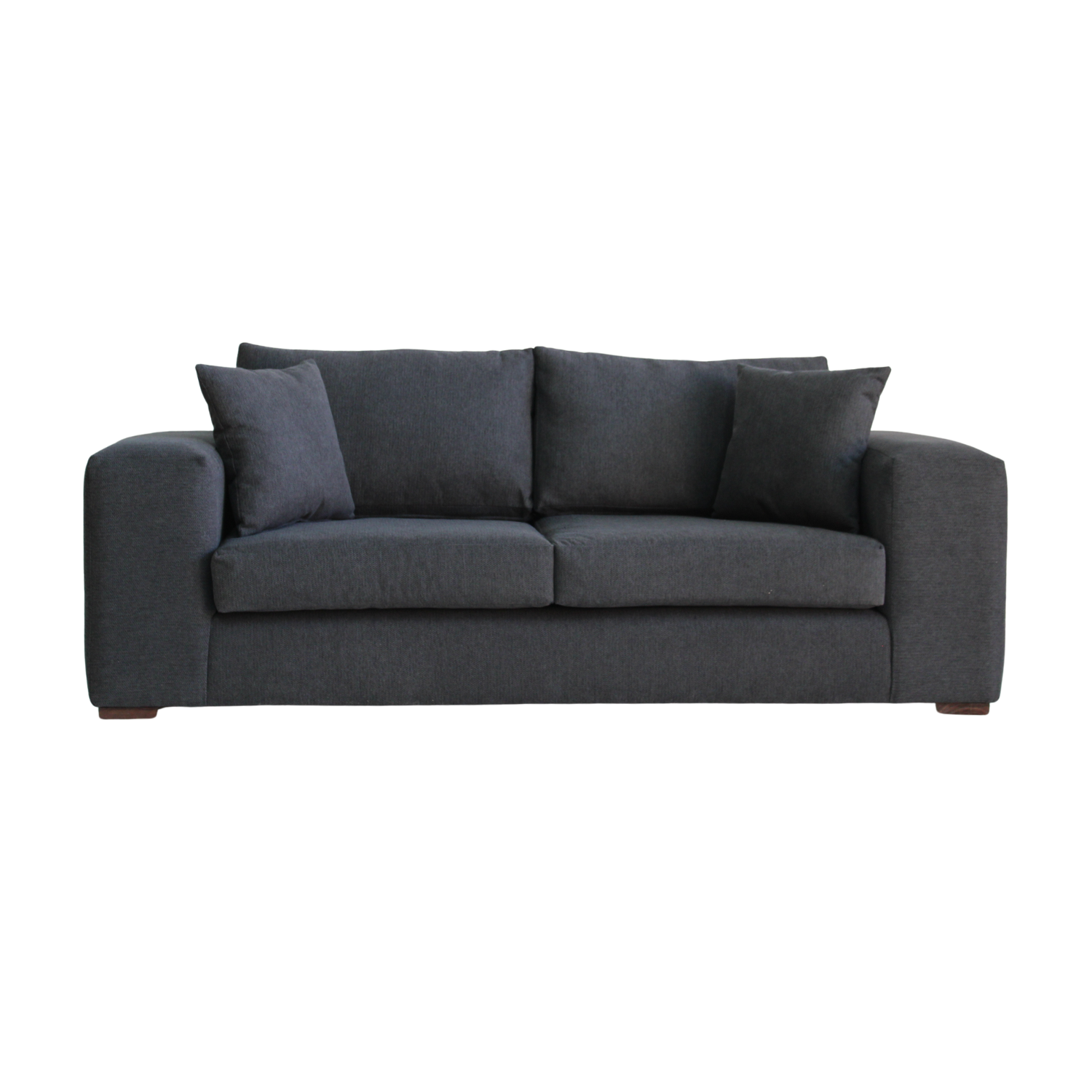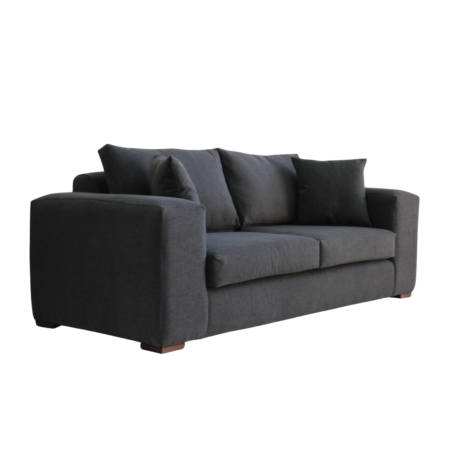 Los cojines de asiento con espuma de alta densidad y respaldo con relleno de algodón sintético entregan un confort superior. Sus patas de madera oscura complementan el diseño con un toque contemporáneo.
